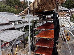 At night, the temperature drops and frost forms easily, so this process is finished in the evening and the persimmons are covered with a straw mat. By covering with a straw mat, the moisture containing natural fructose inside the persimmon is released during the night. This process further dries the persimmons.