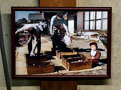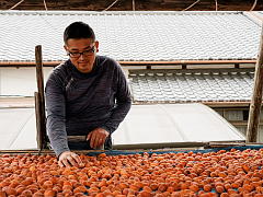 The most important part of this process is to keep the persimmons dry. It is extremely important to avoid getting them wet in the rain. The persimmons are checked frequently while they are drying. This requires practiced skill to know how each persimmon should look and feel during each stage of the drying process.This is very difficult work, which involves climbing a high KAKIYA and bending over for long periods of time.