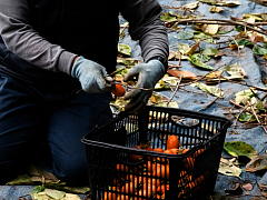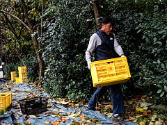 Harvesting is very hard work. The farmer climbs up each tree to pick the persimmons. Around 100 to 150 kg of persimmons are harvested and sorted per person in one day.