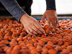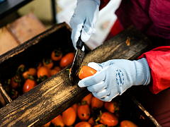 After the harvest, the calyx of each persimmon is removed by hand. Then the persimmons are peeled by machine and by hand.