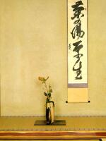 In this connection there is a story of Rikyu which well illustrates the ideas of cleanliness entertained by the tea-masters. Rikyu was watching this son Shoan as he swept and watered the garden path, "Not clean enough," said Rikyu, when Shoan had finished his task, and bade him try again. After a weary hour the son turned to Rikyu: "Father, there is nothing more to be done. The steps have been washed for the third time, the stone lanterns and the trees are well sprinkled with water, moss and lichens are shining with a fresh verdure; not a twig, not a leaf have I left on the ground." "Young fool," chided the tea master, "that is not the way a garden path should be swept." Saying this, Rikyu stepped into the garden, shocked a tree and scattered over the garden gold and crimson leaves, scraps of the brocade of autumn! What Rikyu demanded was not cleanliness alone, but the beautiful and the natural also.