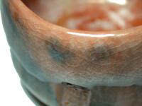 Kichizaemon Raku was third generation in the Raku family of artisans. Today, he is known as the greatest craftsman of that family. He added yellow or vermilion color glaze to the traditional Raku world of only black color. It is said that he was inspired by the creativity of Kohetsu Honami, and the features of his art was light and colorful Raku. He is especially known for perfecting the technique of glazing Raku.