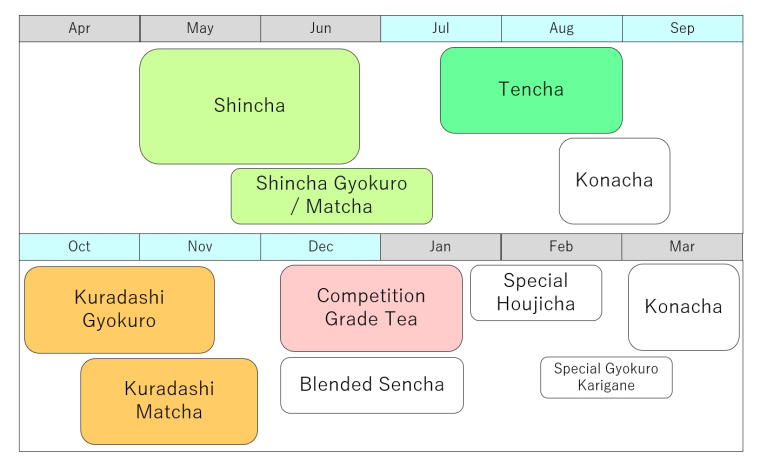 ![]() What is the tea? (Shincha, Tencha, Kuradashi, Competition Grade Tea, Blended Sencha, Houjicha, Karigane, Konacha) |