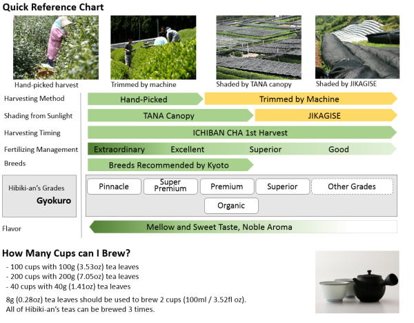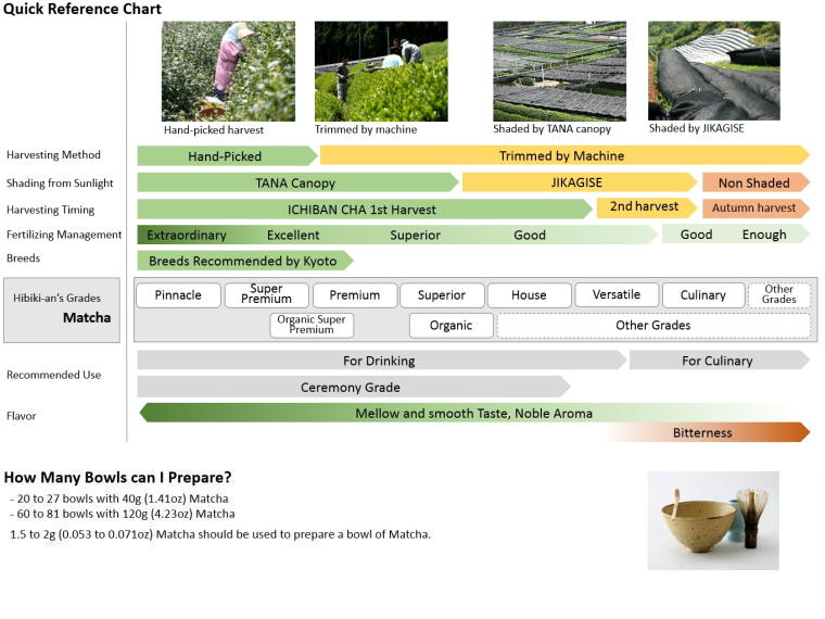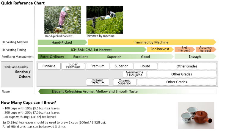 The below charts will help you learn the background, agricultural method, flavor, and features of each grade in each kind of tea. More detailed information regarding the agricultural methods, features, and so on are explained in the below columns.