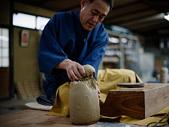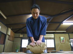 Clay is ordinarily mixed by machines, however to create excellent works like one-of-a-kind Raku-yaki, the clay is mixed by hand to avoid fluctuation in quality. Even skilled craftsman can produce only about 8kg of mixed clay by hand. The machines, on the other hand, can produce about 200kg of it at the same time.