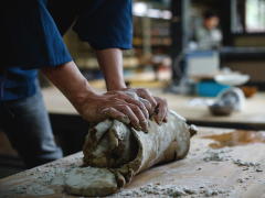 ![]() Clay is ordinarily mixed by machines, however to create excellent works clay is mixed by hand to avoid fluctuation in quality. |