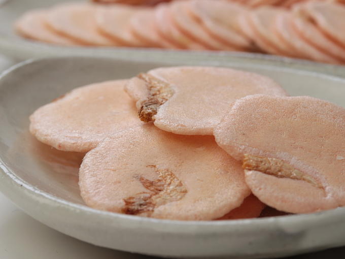 Snappy with a light crunch in texture. Taste has a medium savoriness and a very pronounced shrimp aroma with an aftertaste that lingers on the palate. A great compliment to the umami taste of Japanese green teas but also good eaten as is. These crackers can be addictive as one bite is not enough.