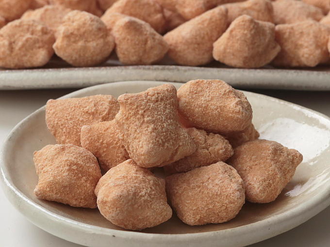 This snack looks rather like sand-colored pebbles with its uneven shape and surface texture. Texture wise it has a soft crunch to the bite, with a hollowness in the middle that helps giving that lightness in texture. Taste wise it is mildly sweet, with a gentle true kinako flavor. On my palate it tastes similar to a sweetened toasted popcorn, especially with that similar texture. This rice cracker is addictive. I think this snack can pair well with hojicha and/or genmaicha. Basically, teas that give off a roasted flavor.