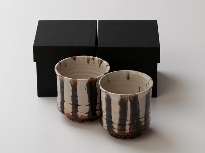 When I saw these yunomi by Mr. Eizan Okuda I knew I would not be disappointed. I’m a fan of Mr. Okuda’s work so I knew these yunomi would be EXQUISITE! They may not look like much in the pictures but there is a lot of work, skill, and detailing behind each yunomi. I purchased the pair. At first glance the brown dripped glaze reminded me of dark chocolate sauce (YUM!). You can use your imagination and they can be other things as well (such as a wooded forest in the winter, brown abstract vertical lines, etc). Although the official description of the inside color is ‘white’, my interpretation is that the color of the interior of the yunomi is a very, very light mocha/creamy white (so we’re talking about shades of brown overall). The outside has carvings, called ROKUROME that run horizontally (hard to see the detail but I’ve included a close up in my pictures). This ROKUROME is very Wabi-Sabi and of all different shapes. When the glaze drips down it fills in the gaps created by the ROKUROME and makes different colors and even more shapes. The base is wide and the whole bottom looks like it has been stained with the glaze (it reminds me of stained wood). Depending on your cup it may be a lighter or darker looking ‘stain’. It was easier for me to notice because I purchased the set so I got one that was a little lighter and one that was darker. One cup was also slightly smaller than the other (which I love!!). I can’t rave enough about these yunomi. I immediately made my Gyokuro Konacha Super Premium and drank from it one of these yunomi and it was delicious!! The rim has been thinned and flared out so even though these are pretty thick and solid, it’s very comfortable to hold and contributes to a very enjoyable green tea (or any drink) experience. I can’t rave enough about these yunomi. They are absolutely stunning (and they even match my granite countertop which I didn’t know until I put it there to take the picture)!! If you’re on the fence with this one…go for it! You won’t be disappointed!
